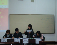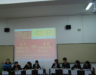 陈雅,邹雨柔为一队,分别为正方三四辩,另一队为高点点,沈照宇,为反方一二辩。另外,外语院一队为正方一二辩,反方三四辩是研究生队。选手陈述流利,有风度,使得比赛富有观赏性。