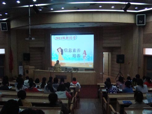 图书馆是较早加入中国高等教育文献保障系统的成员馆,是全国先进图书馆。2009年获湖南省高校图工委‘信息资源建设与共享’先进单位称号。”这让在座同学对湘大的图书馆有了一个整体的认识。接着老师详细介绍了有关图书借阅的相关内容:图书检索,为学生查找图书提供了更多的方便;图书借阅流程,让学生了解借阅书籍的相关步骤;图书借阅的注意事项,则让学生更自觉的遵守相关章程。