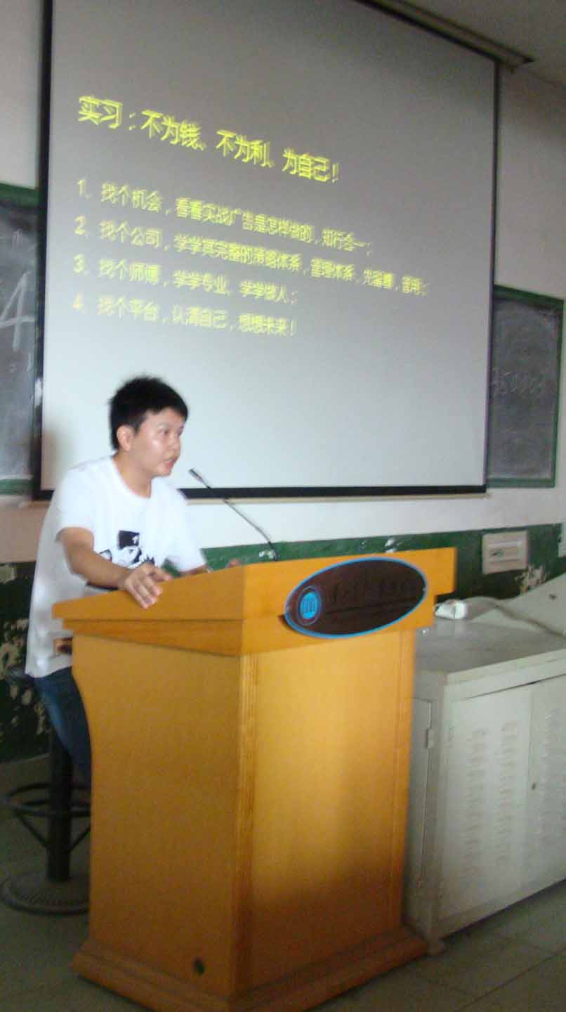 刘子强、文悦骞、罗心碧、田炎平、杨润祥、李芝、谢林青、邓美香、沈竹涵9位优秀实习生代表08级广告两个班的同学,围绕投写简历、工作技巧、实习心态、实习过程中应该处理好的人际关系等方面,向大家讲述了自己在实习过程中的亲身经历和感受。