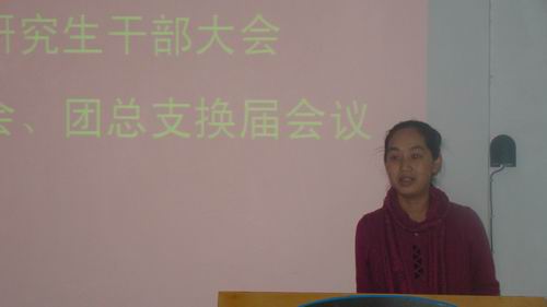 刘璐老师首先总结了第九届研究生会、团支部在过去一年里所做的工作,并对研究生会、团支部所做的工作表示充分肯定。她说,在研究生会主席刘娟的带领下,研究生会各项工作都取得了非常不错的成绩,在联系老师与研究生之间起到了不可替代的桥梁作用,真正为学院服务、为广大研究生服务,她本人对此非常满意。