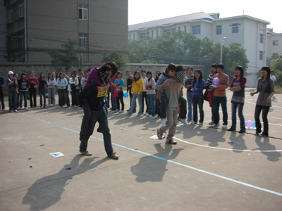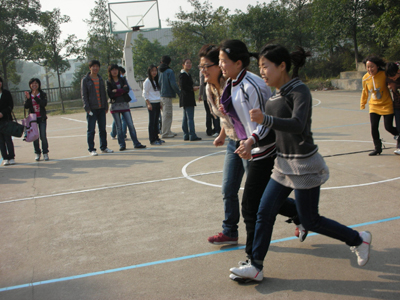 比赛九点开始,趣味运动会当然有别于竞技比赛,比赛的内容与规则由主办方精心设计,要求同学们以三人为小组报名参赛,参加三个项目:三人四足、双人运球和勇往直前,分项计时,计算总成绩,决出前七名。共设一个一等奖,两个二等奖,三个三等奖。比赛过程中出现了一幕幕爆笑的场景:三人四足,难以协调,寸步难行;双人运球,选手用手护球,积分被倒扣;勇往直前,被遮住眼的同学背起同伴摸不着北……欢笑声、呐喊助威声萦绕在整个运动会现场,趣味运动会在这样欢乐的气氛中慢慢走向尾声。