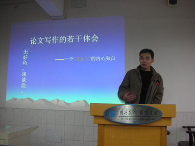 此场文新论坛主要就08级新闻学、传播学专业两名名学生的论文进行讨论。王亮同学和孔岩孔岩分别介绍了各自研究成果 《对大众媒介泛娱乐化的思考——以湖南卫视< 背后的故事>为案例》、《论文写作的若干心得——一个“过来人”的内心独白》。两位学长的讲演见解独到、声情并茂,同学们听得聚精会神,若有所思,纷纷表示收获颇丰。09级新闻学的李静同学说,“学长给我们上了很好的一课,提出了关于论文写作很多好的建议,可以让我们避免走一些弯路。同时我也深深地被学长们的学术激情所感染,他们给我们树立了很好的榜样。”