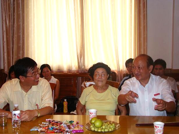 王鲁湘(左一)与恩师曾簇林教授(左二)、张铁夫教授(右一)亲密交谈。