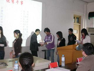 大会的第二项为颁奖,本次表彰大会中,有组织部、宣传部、文娱部和办公室等四个部门获得了“优秀部门”的称号,卢文婷、张玉兰、杨舒、郄治峰、黄曾涛、赵晗、徐雅楠、杨柳、彭珊珊和康国忠等十位部长获得了“十佳部长”荣誉称号,荆彩、周潇、陈威威和于乐等2位同学获得了“优秀干事”称号。