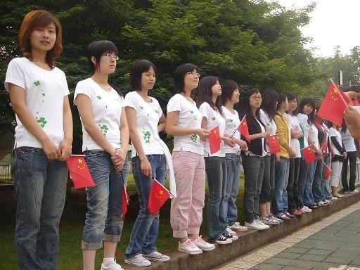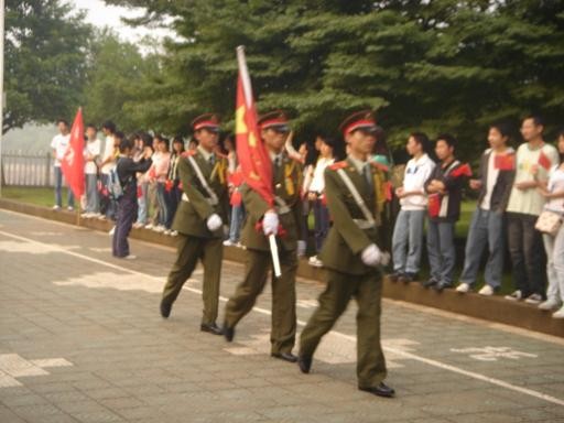 06级广播电视新闻一班统一着班服的同学,他们手中挥舞着小国旗,左臂上贴着心型国旗徽标。在06广电一班的带动下,07级广电一班的同学也加入到升旗仪式的队伍中来。6点在三教门前集合,赶到一教门前,同学们的热情可见一斑。