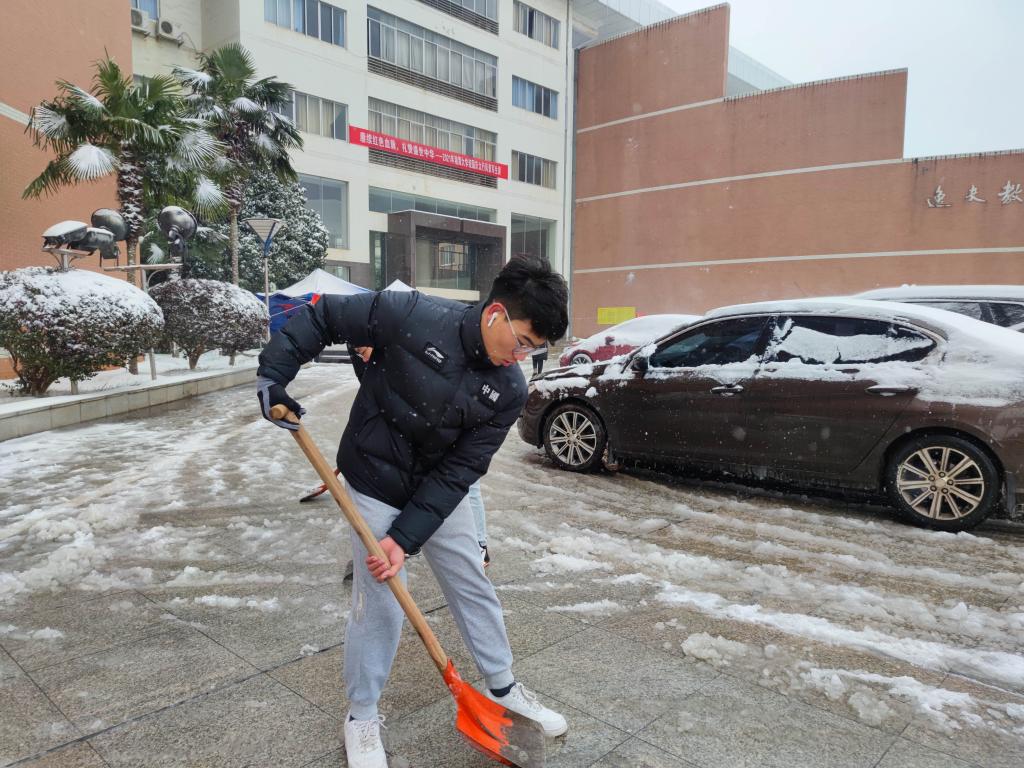 活动发起后,同学们响应迅速。尽管室外温度最低至零下三度,同学们的手和脸都冻得通红,但这丝毫没有影响到大家的热情,手持铁锹、扫帚,铲除积雪,清扫路面,团结协作,干劲十足。经过共同奋战,学校逸夫楼考点大门及台阶的积雪被打扫得干干净净,扫雪任务初步完成。