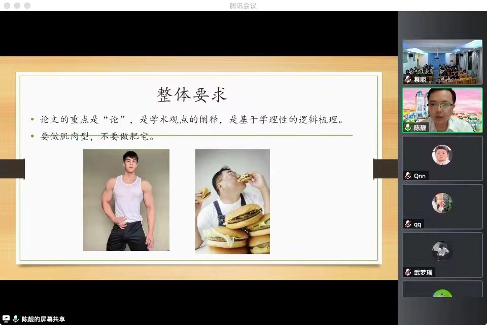 讲座中,陈靓教授从“论文的整体要求”切入,提出论文的重点是“论”,是学术观点的阐释,是基于学理性的逻辑梳理。随后,陈靓教授展示了写作中标题表述、语言表述与论证逻辑等方面的正反案例及注意事项。通过对具体案例的分析,他为大家介绍了学术论证的逻辑方法、安排论证逻辑结构的技巧以及三种不同类型的篇章结构。在讲座中,陈靓教授比喻精巧、旁征博引,深入浅出地将论文结构的各个部分进行了细致地讲解,指出了论文写作中文献综述、摘要、正文段落及结论等各部分存在的问题,并提出相应的注意要点及解决对策。他强调在理论学习过程中不必产生畏难情绪,理论是分析文本的桥梁和工具;理性的东西能助人冷静,而这种思维方式也是一种研究的方式,能帮助大家不断学习和进步。