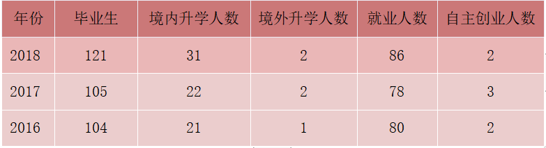本专业近三年毕业生考研率、就业率高,多名学生已考入国内顶尖级学府继续深造,学生就业面广,相当数量毕业生已在各行各业担任重要职务或成为业务骨干,用人单位对本专业毕业生的基本工作能力、核心知识、专业技能、任职期望都给予充分肯定。