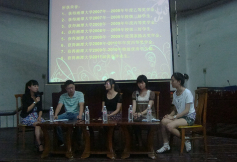在主持人王仁灿的现场采访下,被邀请到的四位在今年研究生入学考试中取得骄人成绩的07级学长学姐与在场09级学生和党支部大一大三成员分享了他们的考研经验和学习心得。他们分别是:考研到暨南大学文艺学的中文2班的李卓、保研到哔咔漫画