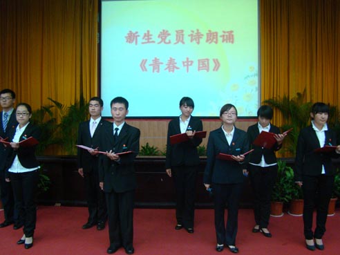 最后,本次活动在8位新生党员充满激情的诗歌朗诵《青春中国》中结束。活动后,新生党员刘羿飞告诉记者:“大学相比高中需要更多的自律,我会严格要求自己,处理好个人与集体的关系,做一名优秀党员。”