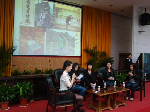 在主持人杨溢介绍完院学生党支部的机构设置和特色活动后,活动进入核心环节——嘉宾访谈。来自中文、新闻、广告和广电四个不同专业的优秀学生党员佘晔、肖丽、左琳和郝婕妤,与在场学生就学习、社团活动、实习及入党方面分享自己的经验与心得。