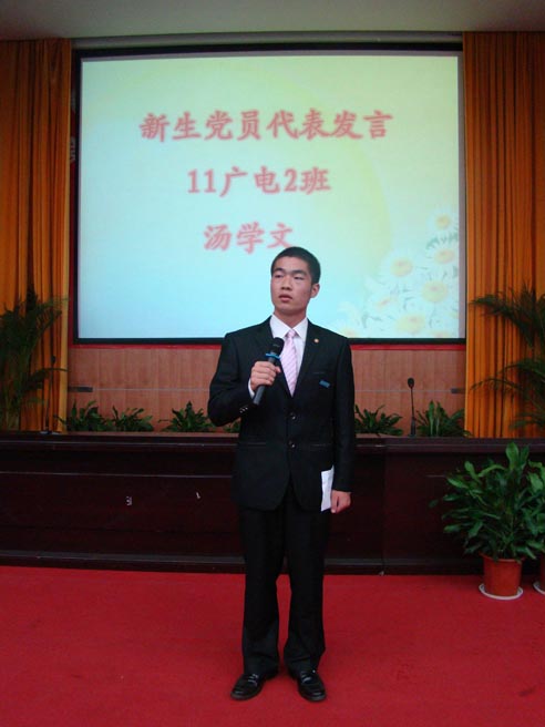 访谈之后,主办方播放了8名11级新生党员军训时的DV短片。其中,新生党员纷纷表示在今后的学习和生活中,将牢记自己的党员身份,肩负党员义务与责任,保持先进性,争做一名优秀党员。在11级广播电视新闻学2班的汤学文代表新生党员上台发言后,新生党员一一上台亮相,廖文婷老师与肖小亮老师为其佩戴党徽,全体与会人员共同见证这一庄严神圣的时刻。