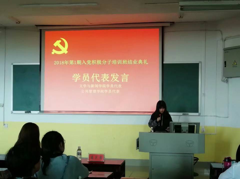 学员代表谢一迪和公共管理学院学员代表黄杰上台分享他们接受这次党课培训后的心得体会。大会第二项,请班主任总结培训班学习情况,对此,班主任主要讲了两点:一是要主动学习,功夫在平时;二是要遵纪负责,为自己而活。