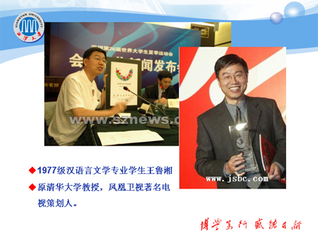 王鲁湘:1977级汉语言文学专业院友。清华大学教授,凤凰卫视著名电视策划人。历任凤凰卫视《纵横中国》总策划、《世纪大讲堂》主持人、《文化大观园》总策划、主持人。