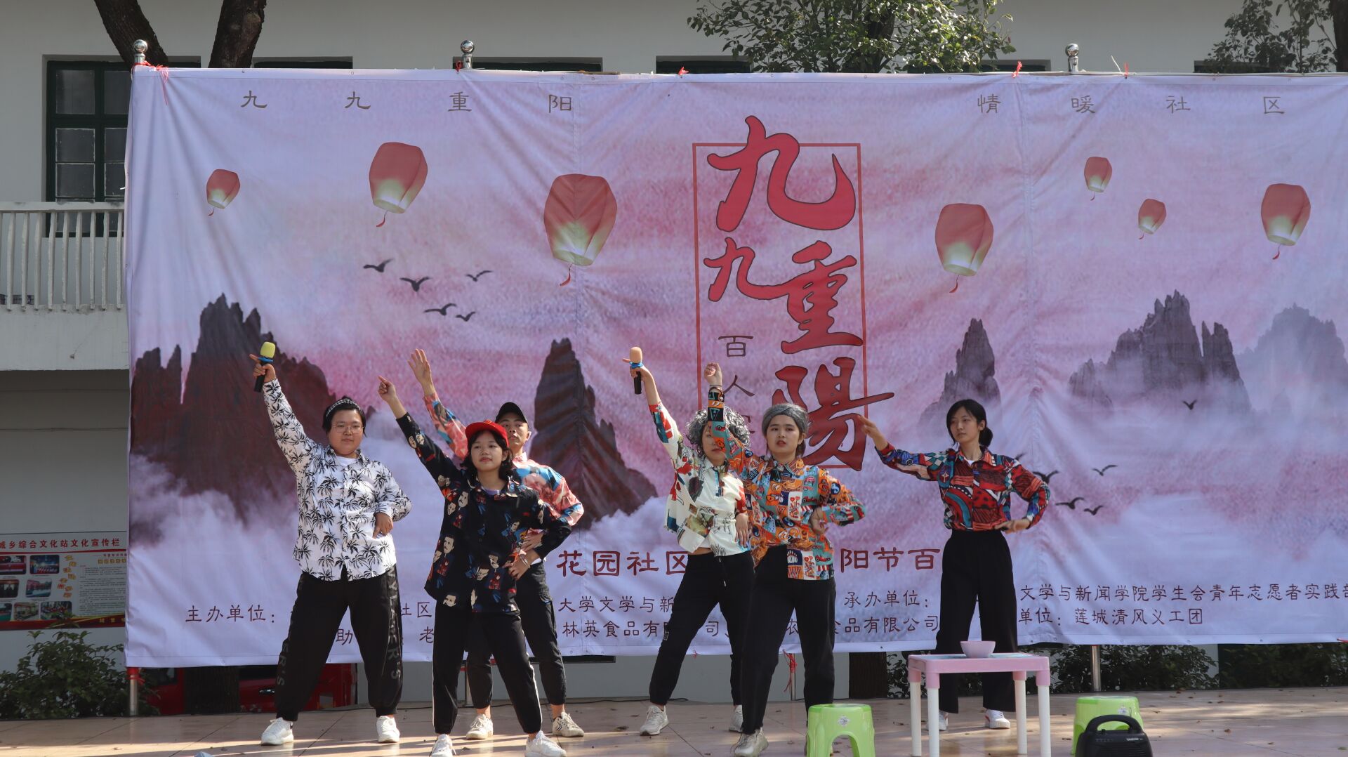 团委书记管胜昔、专职组织员李蜜,莲城清风义工团财务部长罗伏文,花园社区党支部书记罗桂平、主任颜德林,与社区老人和师生200余人,欢聚花园社区文化广场,共庆重阳佳节。