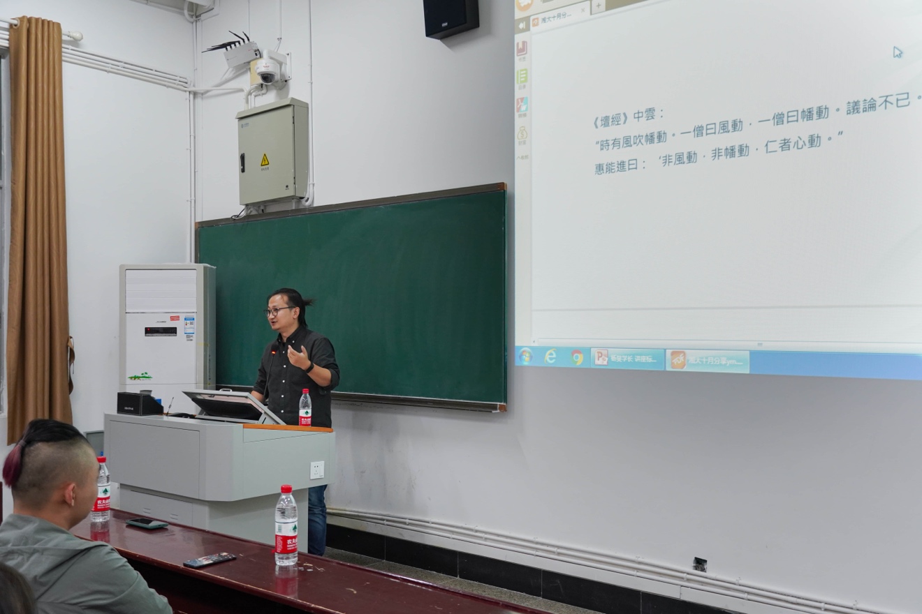 面对迷茫,学长选用了《坛经》中的一段话作为引子:“时有风吹幡动,一僧曰风动,一僧曰幡动,议论不已。惠能进曰:’不是风动,不是幡动,仁者心动。’”