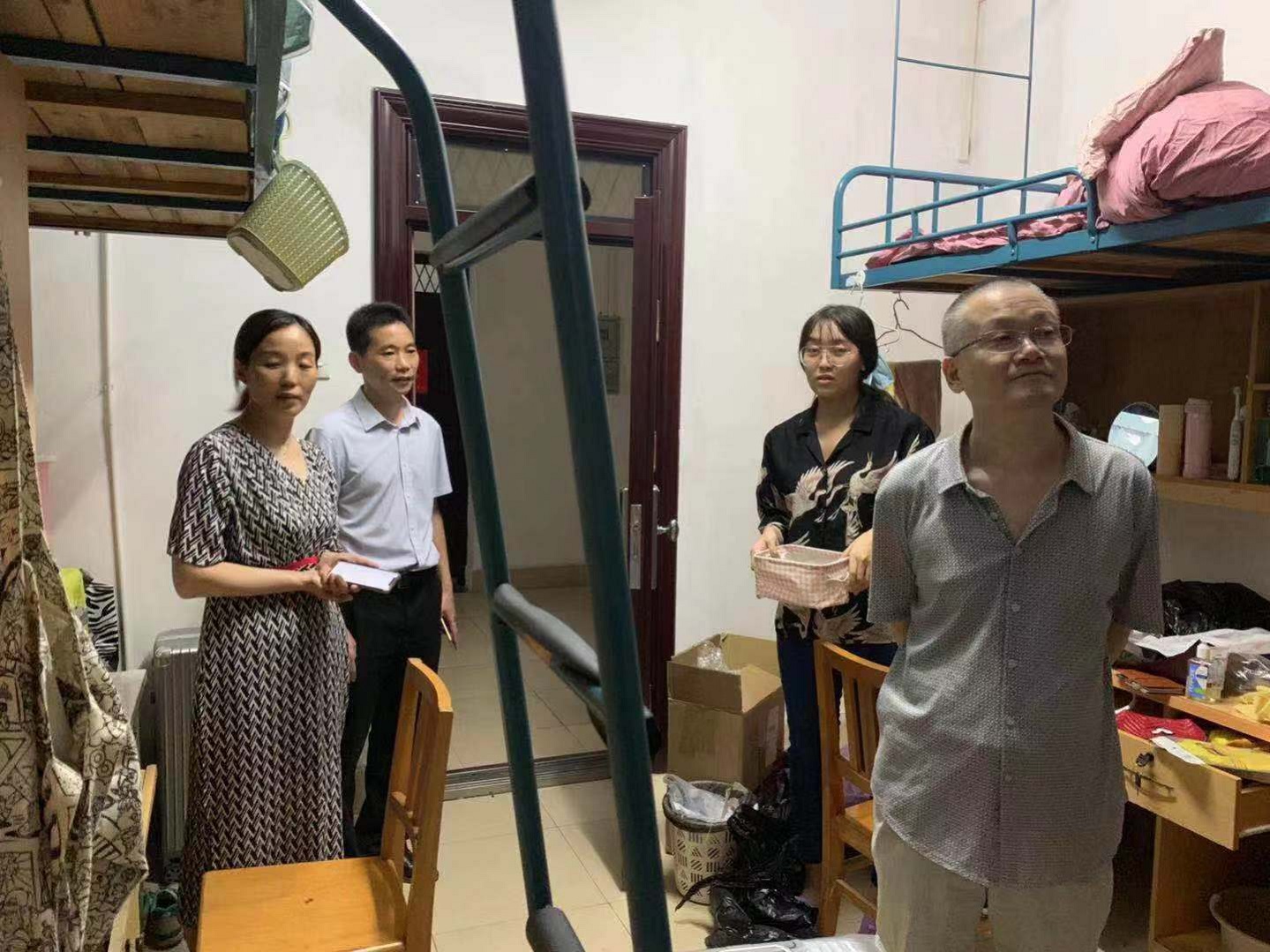 走访过程中,院领导、老师与新生家长们就宿舍条件、适应情况、困难问题等进行交流沟通。在注意到大多寝室都紧闭门窗时,院领导和老师们提醒新生夏季炎热,开空调纳凉的同时更要注意通风问题,同时也提醒同学们湖南气候非常湿润,天气多变,要注意身体健康,有任何不适要及时就医,鼓励同学们在以后的学习中多与老师沟通联系,要对未来的学习生活有信心、有恒心、有毅力!在与家长聊到孩子的适应性和依赖性问题时,领导、老师们耐心开导家长,鼓励家长们放宽心,让孩子多独立,从而学会独立。李院长表示,学校持续关心同学们的诉求和需要,近几年一直不间断地针对生活条件进行着改善与革新,今年上半年,学校基本实现了空调全覆盖,“洋气”的南苑师生餐厅为同学们打造了又一处美食坐标,满足同学们不同的饮食习惯,希望同学们要珍惜继续读书深造的机会,努力学习增长本领,为把自己锻造为国之栋梁、为实现伟大的中国梦而聚力。此外赵书记在与学生家长的交谈时,亲切地关心他们前来报道的出行方式和家长住宿安排,赵书记非常感谢家长朋友们把孩子送到湘大、送到文新院来,同时也表示老师们一定会关心好、教导好、培育好孩子,请家长朋友们放心。
