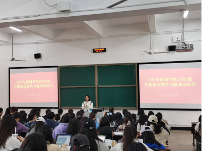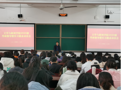 在逸夫楼四阶教室召开2020级考研、实习动员会。院党委副书记周鹏飞、副院长刘晓丽、各系系主任、实习带队教师、全体2020级本科生参会参会。会议由中文系副主任彭慧主持。