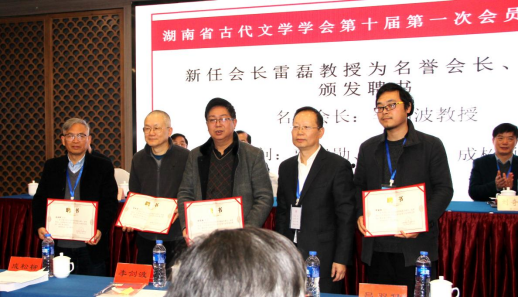 本次会议由湖南第一师范学院文学与新闻传播学院承办,设学会理事会换届、学术研讨、主题教育三项主要议程。18日上午,在湖南省社会科学界联合会、湖南省民政厅工作人员的监督、指导下,按照学会章程召开了换届大会,审议表决了第九届理事会工作报告、《湖南省古代文学学会章程修改稿(草案)》、《湖南省古代文学学会会费收取标准》,通过无记名投票的方式选出了第十届理事会、常务理事会,雷磊教授当选为会长,湖南师范大学吕双伟教授、吉首大学罗惠缙教授、湖南科技大学刘奇玉教授、湖南大学牛海蓉教授、长沙理工大学郑劭荣教授为副会长,符继成教授为秘书长及法定代表人,谷文彬副教授为党支部书记。此外,推选李剑波教授担任学会名誉会长,湖南大学郭建勋教授、湖南科技大学王友胜教授、长沙理工大学成松柳教授担任学会顾问,并现场颁发聘书,以表彰他们为学会发展做出的贡献。