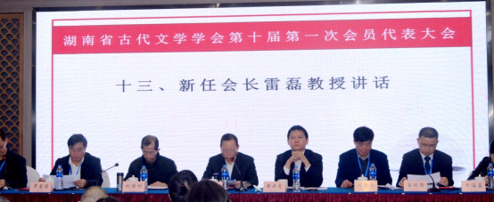 新任会长雷磊教授在当选后发表了讲话,他表示新一届学会领导班子、理事会成员将继承学会的优良传统,团结协作,开拓进取,在省社科联、民政厅的指导下,在各高校、科研院所的支持下,不断创新工作的方式方法,进一步加强学会内外交流,帮助会员成长,为推动湖南省古代文学教学与研究事业的发展发挥更加积极的作用。湖南省社科联机关党委(人事处)常务副书记、处长、社会组织行业党委副书记黄云志,湖南省民政厅社会组织管理局调研员刘谋利在会上高度评价了学会近年来的工作成绩,充分肯定了选举过程的严谨有序,同时也对学会新一届理事会在思想政治、具体业务等方面的工作提出了要求与期望。