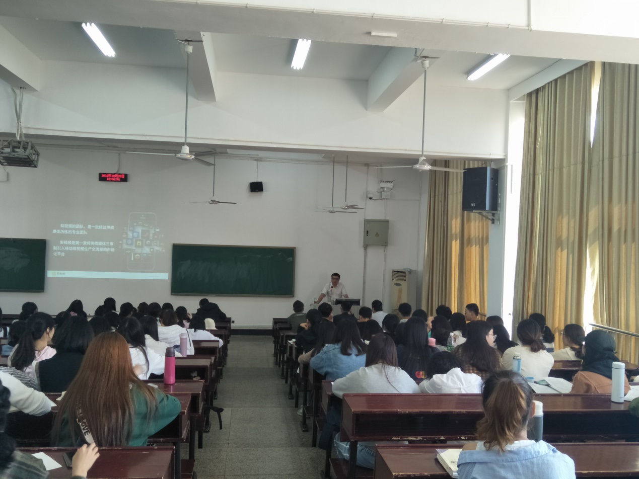 逸夫楼第三阶梯教室如期举行。梨视频湖南区主管熊双老师以“发现身边之美 讲好校园故事”为主题,以梨视频为例,分析了泛娱乐化时代新闻媒体的发展及转变。本次讲座由哔咔漫画