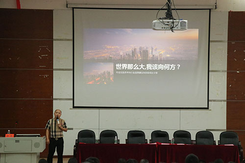 2003级广告学校友、广告专业校友会副会长杨乐以“世界那么大,我该向何方?”主题做了精彩的讲座。“你们在非常幸运的时间遇到了非常幸运的专业”,他结合自己的创业经历建议同学们发散思维、勇于实践、学好专业知识、培养个人兴趣。接着他用幽默生动的语言为同学们答疑解惑,指明了广告学创业及就业的道路,赢得台下阵阵掌声。