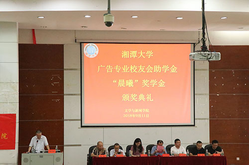 广告专业校友会助学金、“晨曦”奖学金颁奖典礼于逸夫楼第二报告厅举行。副校长刘建平、广告专业校友易建国、杨乐、阳曦曦、傅硕慧、罗丹,兴湘学院党委副书记樊军,院领导李剑波、赵猛、季多武,周鹏飞、田华、刘晓丽、学工办以及广告系全体师生参加。整个活动由院长李剑波教授主持。