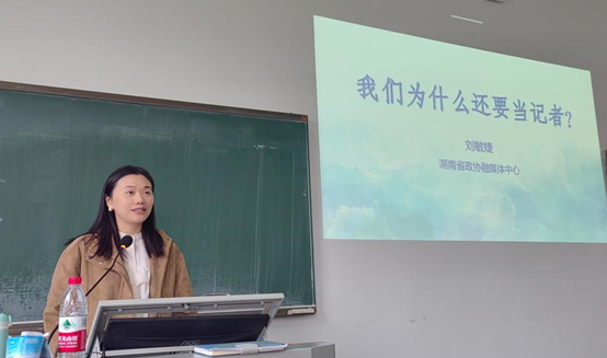 逸夫楼408教室精彩开讲。讲座围绕主题“我们为什么还要当记者?”展开,邀请湖南省政协融媒体中心采访部主任、首席记者刘敏婕老师担任主讲嘉宾。讲座由唐永亮老师主持,2023级新闻学专业学生参加。