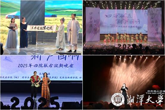 、国际交流学院(处)、哲学与历史文化学院(碧泉书院)、外国语学院四院联袂呈现。整场晚会以“湘遇·融入”与“回响·交融”上下半场为脉络,荟萃了说唱、器乐合奏、舞蹈、朗诵、相声等12个形式多样的节目,充分展现学子们的蓬勃朝气,更传递出深刻的文化交融内涵。