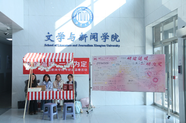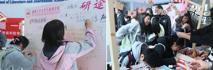 一走进大厅,温暖的气息就扑面而来!明信片书写桌前早已排起小队伍,师生们纷纷拿起笔,把“愿你笔锋所至皆坦途”“考研必胜,等你凯旋”这些暖心话细细写下。另一边的“砥砺同行签名墙”更是吸睛,一个个工整的签名、一句句热血的留言,就像一束束微光汇聚成星河,勾勒出最动人的“守望画卷”。大家你一言我一语地互相鼓劲,备考的疲惫仿佛都被这股温情冲淡了。