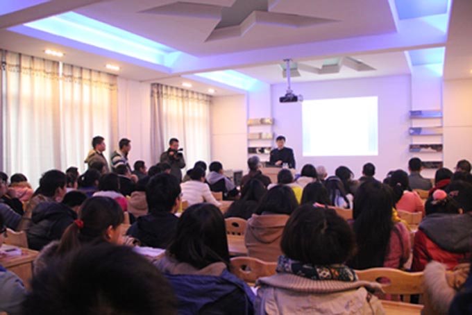 318学术报告厅座无虚席,100多名师生在此聆听日本早稻田大学文学学术院稲畑耕一郎教授和北京大学中文系廖可斌教授的主讲的“韶峰名家论坛”学术讲座。