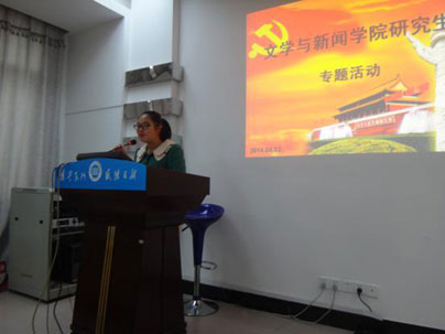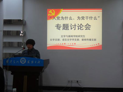 研究生文学党支部、语言文字党支部、新闻传播党支部在第三教学楼318多媒体教室组织召开专题讨论会,组织全体党员重温入党誓词;重新学习党章;对“入党为什么,为党干什么”展开深入讨论,会议由文学支部书记钟怡芸主持,全体研究生党员参加了会议。