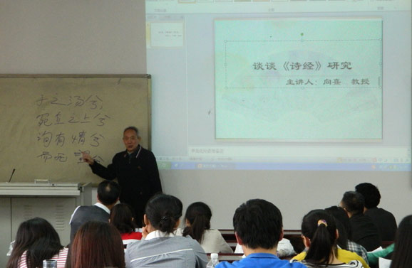 “《诗经》是中国古代诗歌的根,是中国古代文化的代表作品。”向熹教授首先论述了《诗经》在我国诗歌史上的地位,然后,“点、线、面”的讲述了《诗经》“风、雅、颂”三部分的情况。他认为《诗经》三部分内容“讲德”、“讲仁”、“讲孝”及“讲悌”等“全方面的反映了中国古代的生活。”“《诗经》全诗不过2万多个字,但是却很难读”,其举例《国风•陈风•宛丘》作了说明。即使难读,但是“研究《诗经》的著作文章在20世纪就已经有6000多件”。他认真地给在场的学生介绍了马瑞辰、陈子展及余冠英等前辈所做出的努力和成果。同时,他也提到了自己在研究《诗经》中的一些体会和经验。比如,在译注《诗经》的过程中应该“忠实于原文”、“讲究押韵”、“标出韵脚”等“便于读者理解”。