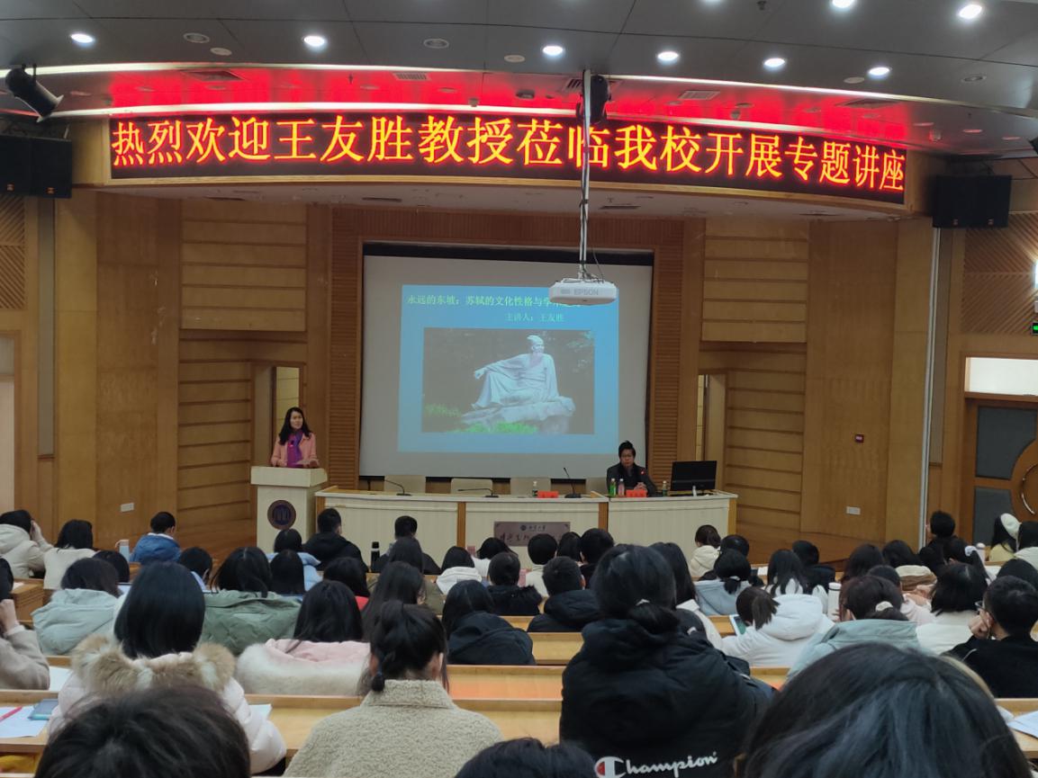 王友胜教授攻读博士时师从复旦大学著名学者王水照先生,20多年来沉潜精思,使他对苏轼生平、诗文创作、心性品格及学术成就如数家珍。他研究苏轼,热爱并崇敬苏轼。在王教授眼里,苏轼不仅是文学大家,更是他的精神偶像与灵魂归依。囿于时间,王教授对苏轼生前与死后九百年来受到的推崇、研究,特别是对上世纪八十年代以来苏轼研究动态只做了简要地历时梳理。他强调苏轼不仅属于中国,也属于世界,将苏轼其人其文传播到海外,让世界了解苏轼,还任重道远。