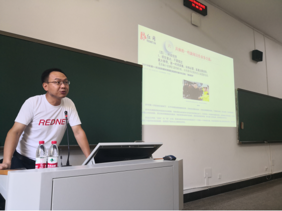的报道引入,提醒同学们关注身边的故事,注意挖掘素材和典型人物。之后,李站长又从多个方面分别论述了新闻宣传的重要性、新闻从业者自身的技能需求、新闻宣传的态度要求、新闻宣传的具体业务、对时政信息的报道、新闻宣传的常见问题等诸方面的内容。对每个版块的讲述都搭配了相应案例进行说明。