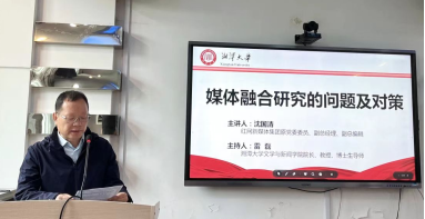 讲座以“媒体融合研究的问题与对策”为主题,聚焦新闻传播与媒介管理的关键问题。沈国清教授在分析新媒体时代舆论格局的变化后,认为我国舆论界“坚持一个声音”是基于国家健康平稳发展的合理选择。在提到县级融媒体中心的发展时,他认为县级融媒体建设的核心是“三化”,即移动化、视频化、服务化。