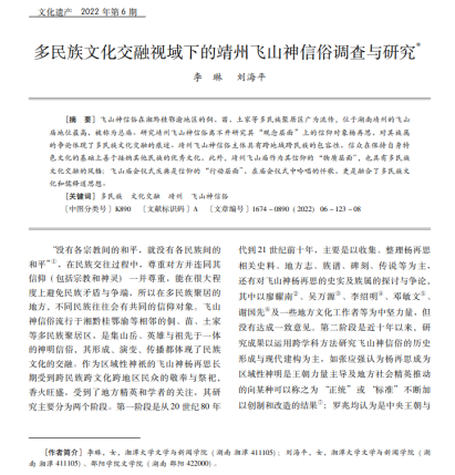 民间文学方向专业教师李琳教授和其博士刘海平合作完成的论文《多民族文化交融视域下的靖州飞山神信俗调查与研究》刊发CSSCI期刊《文化遗产》2022年第6期。