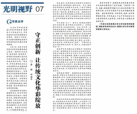 李琳教授与博士刘海平合作文章《守正创新 让传统文化华彩绽放》在2023年6月26日《光明日报》理论版刊载。