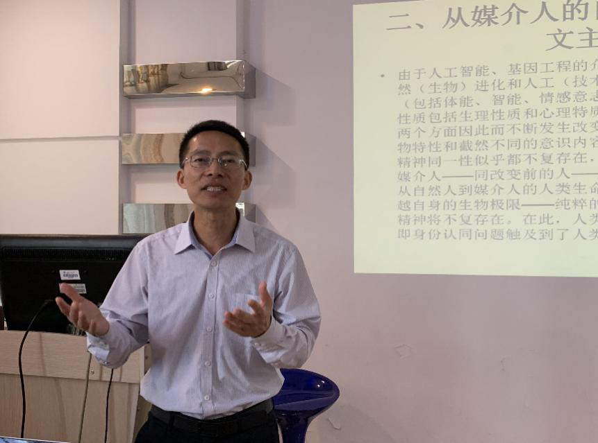 李智教授分别以“从自然人到媒介人”、“媒介人的自我同一性到人文主义”和“媒介人的新人文主义意涵”三个篇章由浅入深地论述从媒体融合到人文主义意涵的演变。首先,李智认为媒体融合时代下,“媒介融合”之“融”从终极意义上来说是指媒介与人或人与媒介的融合,人与媒介间的界限会日渐消弭并将导致从“自然人”到“媒介人”的跨变。接着他指出,由于自然进化和人工智能技术的双重作用,人逐渐物化,而物也趋向人化,人的自我同一性即身份认同问题将受到质疑;同时,旧的人文主义意涵也面临挑战。最后,李智教授引出此次讲座的主题概念——媒介人的新人文主义意涵。也就是说,作为个体的人不再是传统人本主义意义上具有固定本质的实体性存在,人的社会关系性才是人的本体或特性,人将成为一种社会关系性的存在,即“实体本体论”将逐渐演变成“关系本体论”。除此之外,李教授在展望新人文主义时还援引了“人类命运共同体”的概念,提出人们要维护关系网络,构建良好的以“关系”为核心的人际交往和国家交往秩序才是未来发展的趋势。