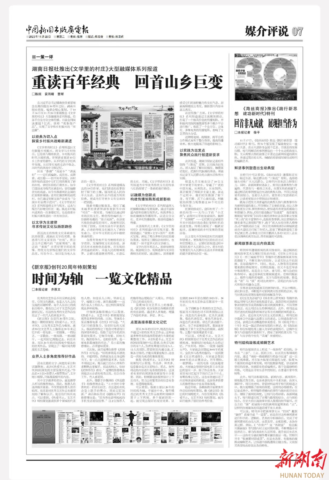 在习近平总书记精准扶贫重要理念在湘西提出10周年之际,湖南日报社党组、编委会精心策划,于10月16日至11月20日重磅推出《文学里的村庄》大型融媒体系列报道,经各平台全方位立体传播,目前全网阅读量超7亿次,堪称“现象级产品”。实现了文学和乡村振兴的“双出圈”。