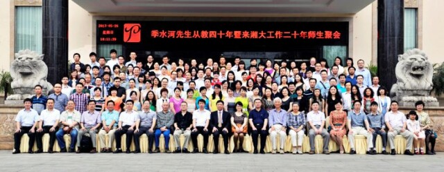 2013年3月,我的几位学生找到我,说今年是我从教40周年,也是来“湘大”工作的20年,希望搞一个师生聚会活动来祝贺。我对这一形式并不在意,但能和学生们聚一聚,聊聊天,我是非常乐意的。本以为就是二三十个在校学生一起聚聚,但没想到的是,他们自发组织,通过QQ群和打电话,联系上了我来“湘大”后带过的一、二届本科生代表、硕士生、博士生共二百多名学生。5月26日,这些学生从天南地北赶回“湘大”,欢聚一堂,为我同庆纪念。