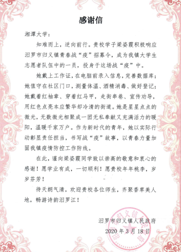 (记者程心愉)青春“她力量”,抗疫显担当。近日,一份来自湖南省汨罗市归义镇的《感谢信》在哔咔漫画