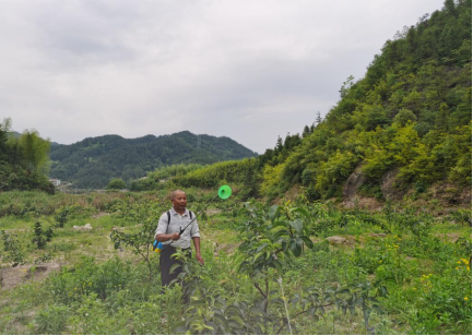 (洪帽南在给果树喷药)