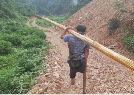 (刘道东一人扛树走在小路上)